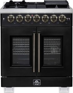 The Forno Capriasca 30 Inch French Door Dual Fuel Range in black with antique brass accessories brings professional-grade style and performance into your kitchen. Its signature French doors open outward to provide up to 12 inches of extra clearance, giving you easier access to the oven.Read More