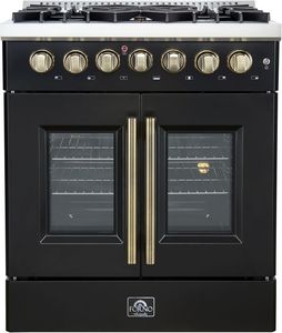 Our 30" Galiano Dual Fuel French Door Range blends timeless design and high performance. Featuring a sleek black finish and antique brass knobs, this range adds sophistication to any kitchen at an affordable price. The cooktop boasts five sealed burners with a total output of 68,000 BTU, including a 20,000 BTU dual-ring burner ideal for boiling, searing, or simmering delicate sauces.Read More
