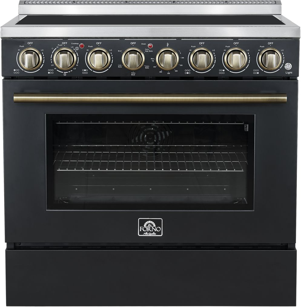 The Forno Paolo 36 Inch electric range in black with antique brass knobs and handles combines power and style for the modern kitchen. Its smooth ceramic glass cooktop features five radiant elements with 9,800 watts of total output. The 5.44 cu. ft. true convection oven delivers fast, even results with a 1,200-watt fan and 3,000-watt high-powered baking and broiling elements. A hidden bake element, bright halogen lights, and a large viewing window add convenience. This freestanding electric range also includes a 100-watt warming zone and dual-element broiler for precise, high-heat cooking.Read More