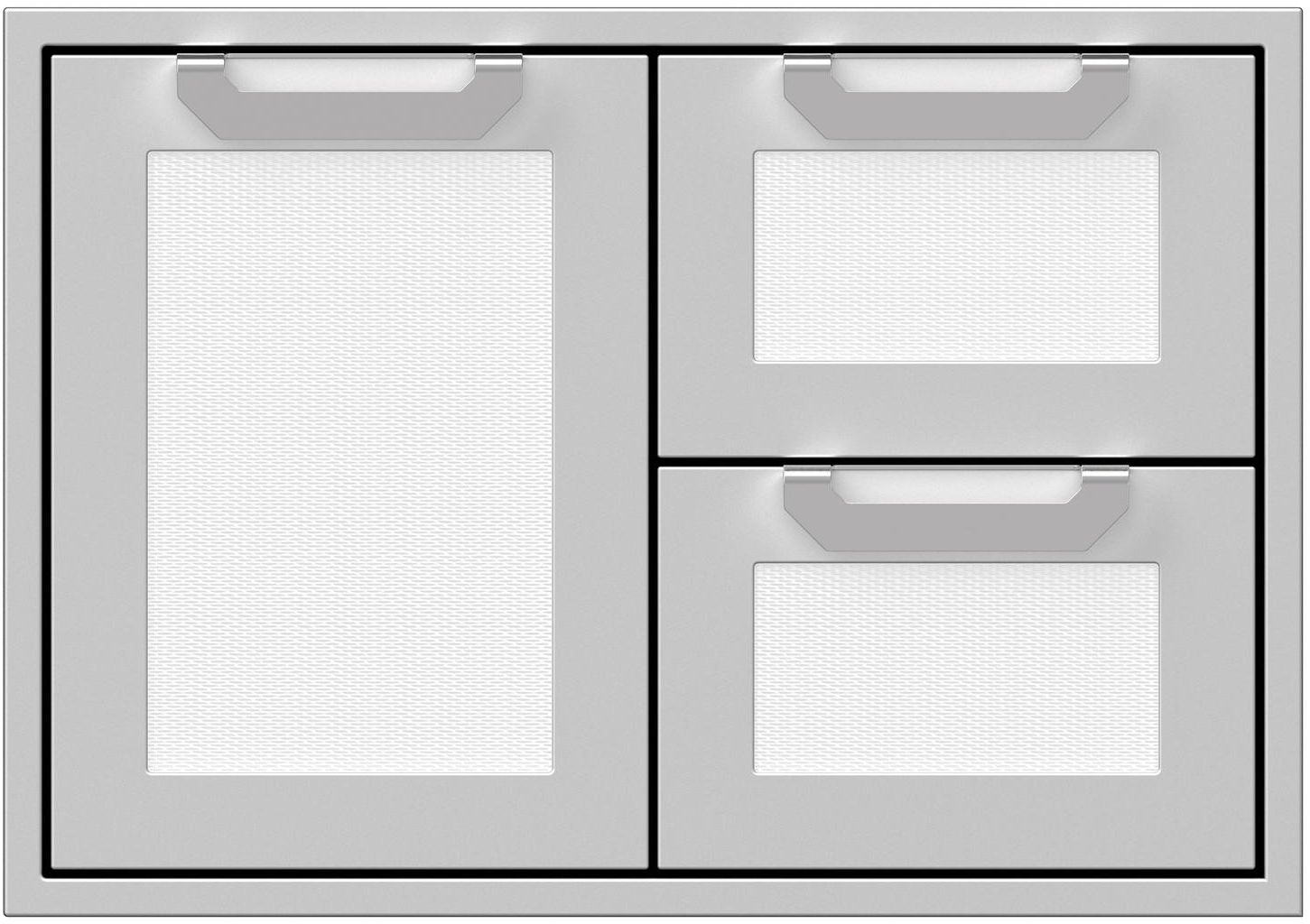 Combo door/drawers deliver highly convenient heavy-duty storage. The commercial-grade handles, recessed Marquise Accented™ panels and heavy-gauge welded body complement Hestan grills in form and function.Read More